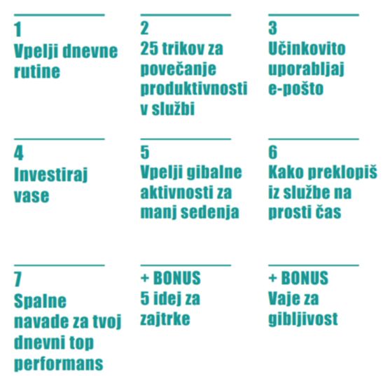 Od vpeljave učinkovitih rutin, organizacije dela, povečanja produktivnosti, aktivnega dela, investiranja vase do spalnih navad, zajtrkov za super začetek dneva ter vaj za izboljšanje gibljivosti
