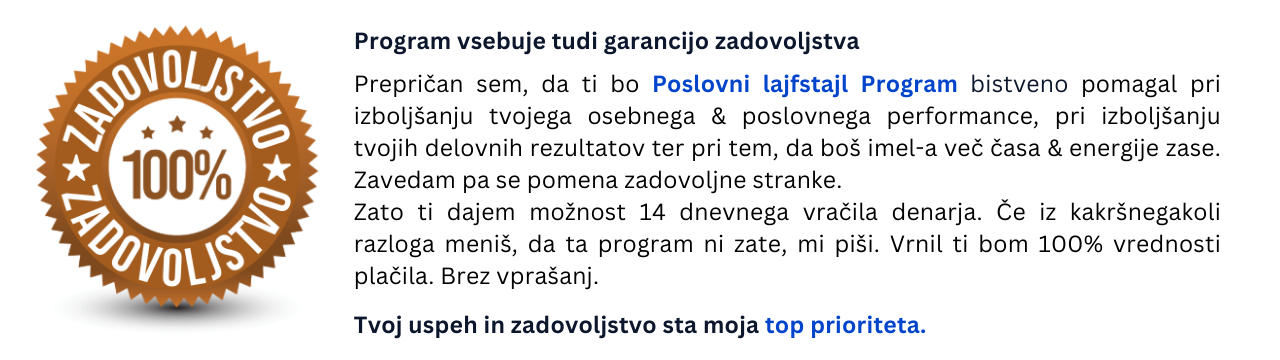 "Veliko stvari sem delal, a ne dovolj dosledno, tako da me je tvoj Poslovni Lajfstajl Program opomnil na to in se poskušam bolj disciplinirano držati številnih osnov: hitro vstajanje, bolj organizirano delo, postavljanje rokov in držanje teh časovnic itd. Všeč mi je bilo, da si me opomnil na pravilo 80/20 in 1% izboljšanje vsak dan ter krajšanje mailov. Program definitivno priporočam vsem, ki želijo izboljšati svojo učinkovitost, rezultate dela ter navade"